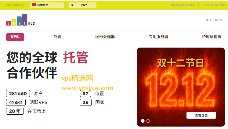 JustHost.Asia 双十二促销活动已经开始了,VPS 首次购买可享 5 折优惠,另有选择年付 VPS 享 5.5 折循环优惠。本次促销参与的机房有美国纽约/西雅图/达拉斯,德国法兰克福,荷兰阿姆斯特丹,瑞士苏黎世,芬兰赫尔辛基。justhost 是一家 2006 年成立的老牌主机商,已在全球 31 个国家/地区部署了 45+ 数据中心,支持自助更换机房/IP(最多可以换 50 次),支持 PayPal、支付宝等付款方式。