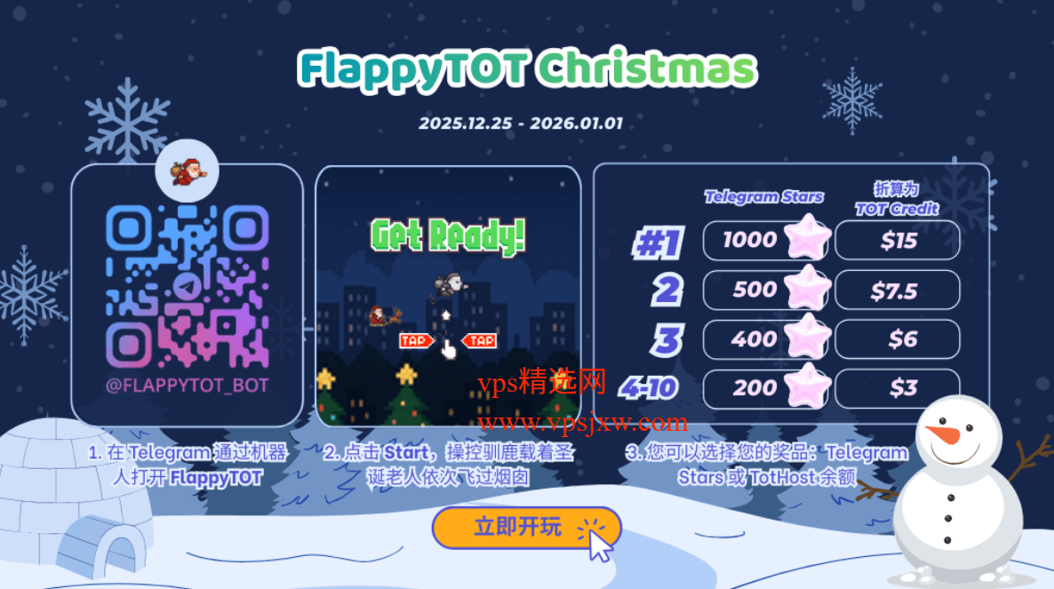 TOTHOST 在圣诞、元旦佳节之际,为答谢新老用户特意推出双旦特别活动,包含了丰富多彩的互动环节和惊喜赠好礼。活动一为做问卷即可领取$3 直接充值到账户余额中,活动二是邀请大家一起玩一款超简单的 FlappyTOT 迷你游戏,迎接平安温暖的圣诞季和灿烂的新年,活动期间还有多份高价值奖励等你来拿,高达 $15~30 万越盾丰厚好礼等。TOTHOST 是一家 2013 年成立的越南主机商,主营 VPS、VDS 和独立服务器,机房在越南河内,官网支持中文等 3 种语言切换,支持支付宝、PayPal 等付款方式。